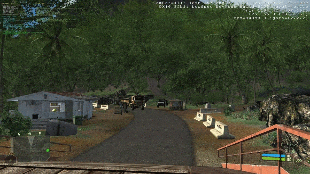 So what exactly was going on to make the game so demanding on hardware? We can get a sense of what's happening behind the scenes by running the title with 'devmode' enabled. This option opens up the console to allow all kinds of tweaks and cheats to be enabled, and it provides an in-game overlay, replete with rendering information.